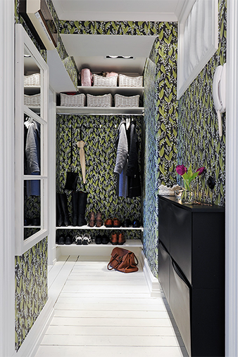 Outro cômodo que chama atenção e faz a gente querer se jogar dentro através da tela do computador é o quarto. Delicado, feminino e floral, ele conta até com mini closet fechado por uma simples cortina branquinha – detalhe que eu adorei mesmo! Mas mais uma vez o papel de parede e é que toma todo o lugar: a escolha aqui foi um rosinha para combinar com a sala, mas floral – bem delicado e aconchegante, por sinal! O quarto dá para o corredor – nele, um papel de parede verdinho!