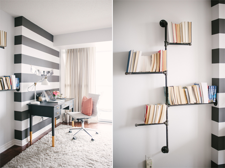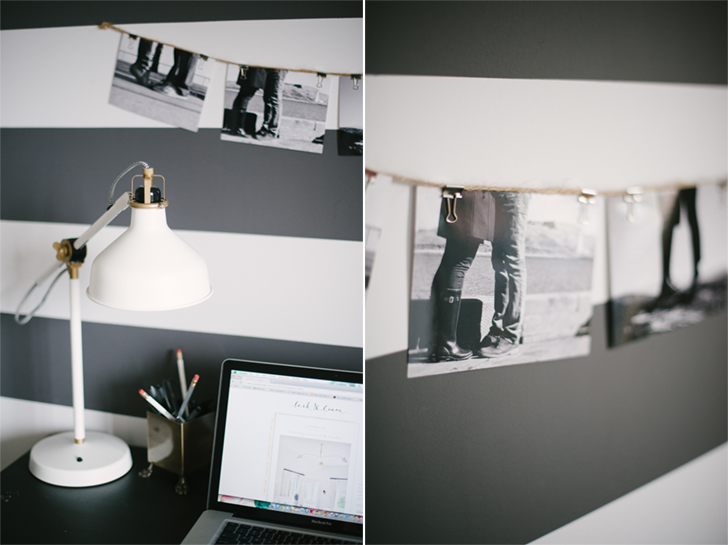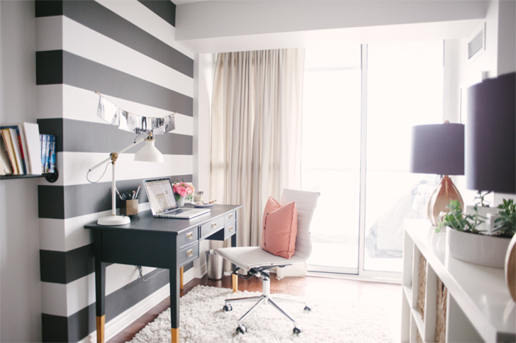 Eu amei ambas as salas, de estar e de jantar, mas preciso confessar que o que chamou mais a minha atenção realmente foi o espaço do home office. A mesa é originária da Ikea e ao longo de 25 anos foi reformada até a configuração atual, pintada com tinta preta deixando as pernas expostas. Eu gostei também da parede listrada em preto e branco, mas acho que algo assim só funciona quando você tem realmente uma excelente iluminação.