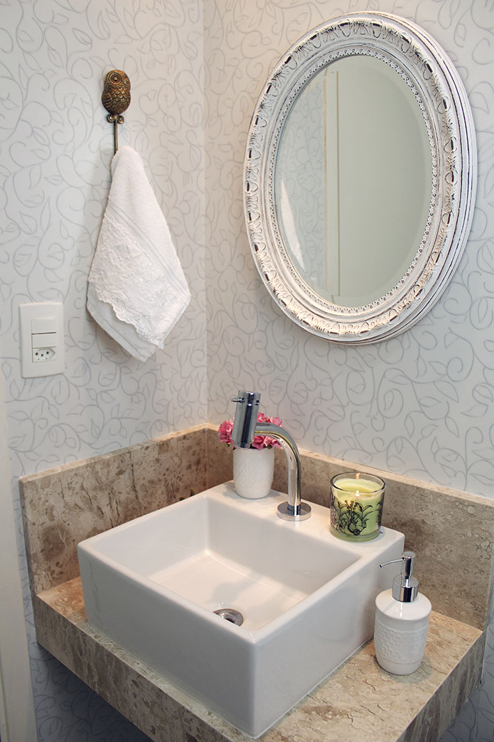 Se você estiver precisando de dicas para decorar um banheiro pequeno, eu já escrevi um post com várias soluções de decoração para banheiros pequenos e modelos para se inspirar! Para ver o post, é só clicar aqui. Vocês também verão vários lavabos revestidos com papel de parede, então se quiser saber mais sobre onde usar, como instalar, como limpar e onde comprar papel de parede, é só clicar aqui.