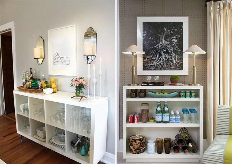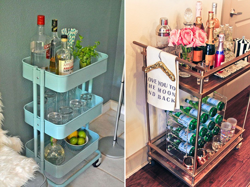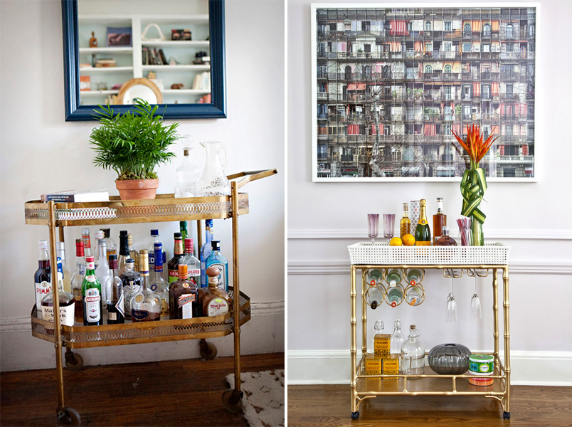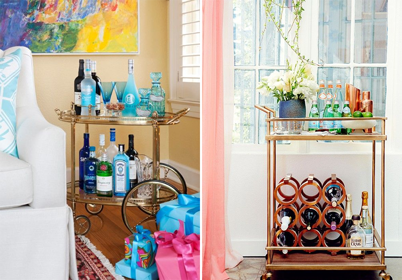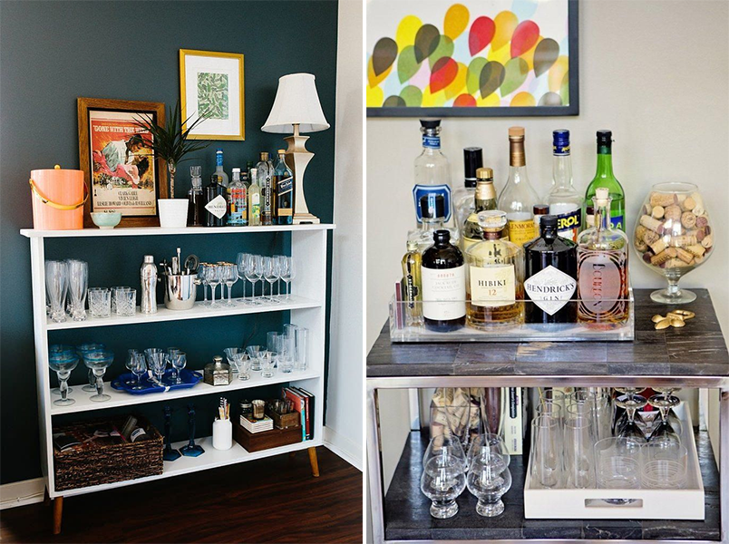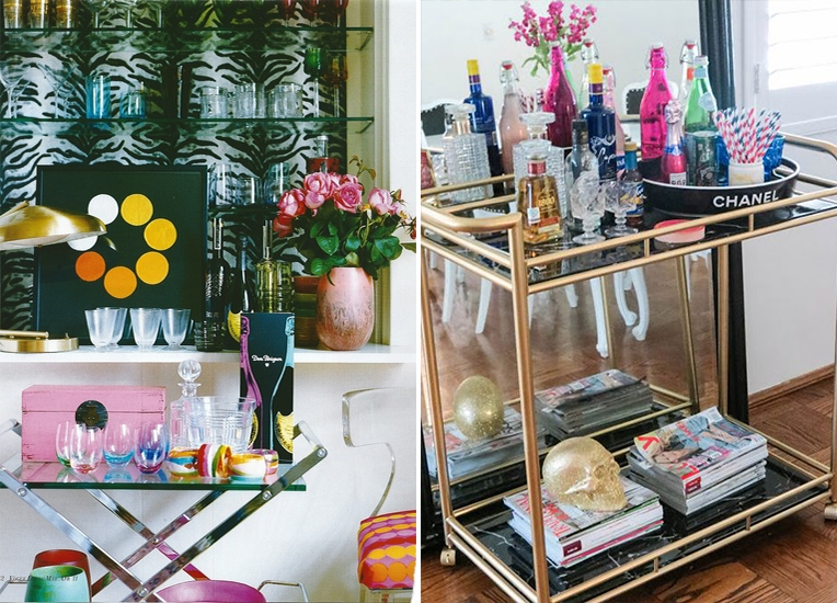 E é claro que eu não deixaria de compartilhar com vocês as dicas e inspirações que eu encontrei! O mais legal é você perceber que não precisa de um grande espaço ou móvel para ter o seu barzinho. Na maioria das vezes uma bandeja bonita bem localizada já garrante todo o charme que você quer criar! E não precisa ter dezenas de tipos de bebidas, não! Algumas poucas garrafas e os ingredientes certos para preparar os drinks mais gostosos com elas já é o suficiente! Quer ver só?