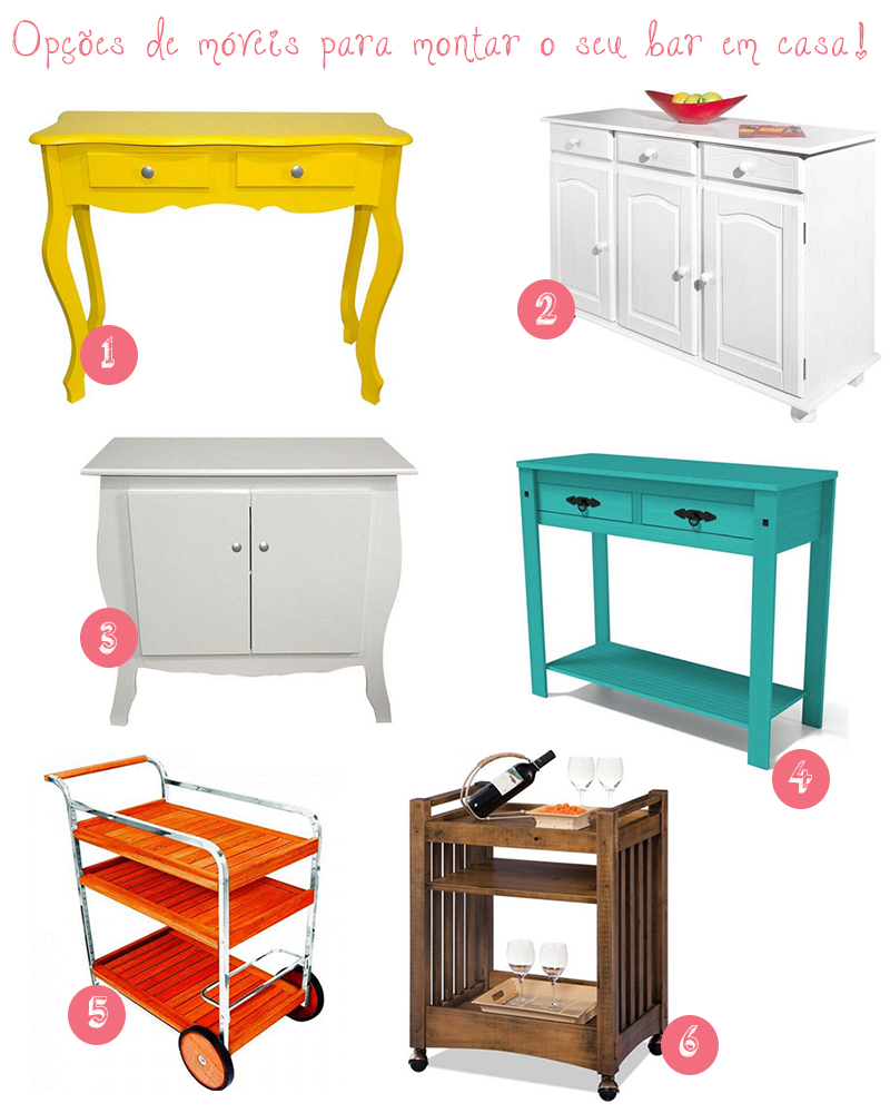 Eu também selecionei algumas opções de móveis que podem ser usados para montar o seu bar em casa! Olha só: