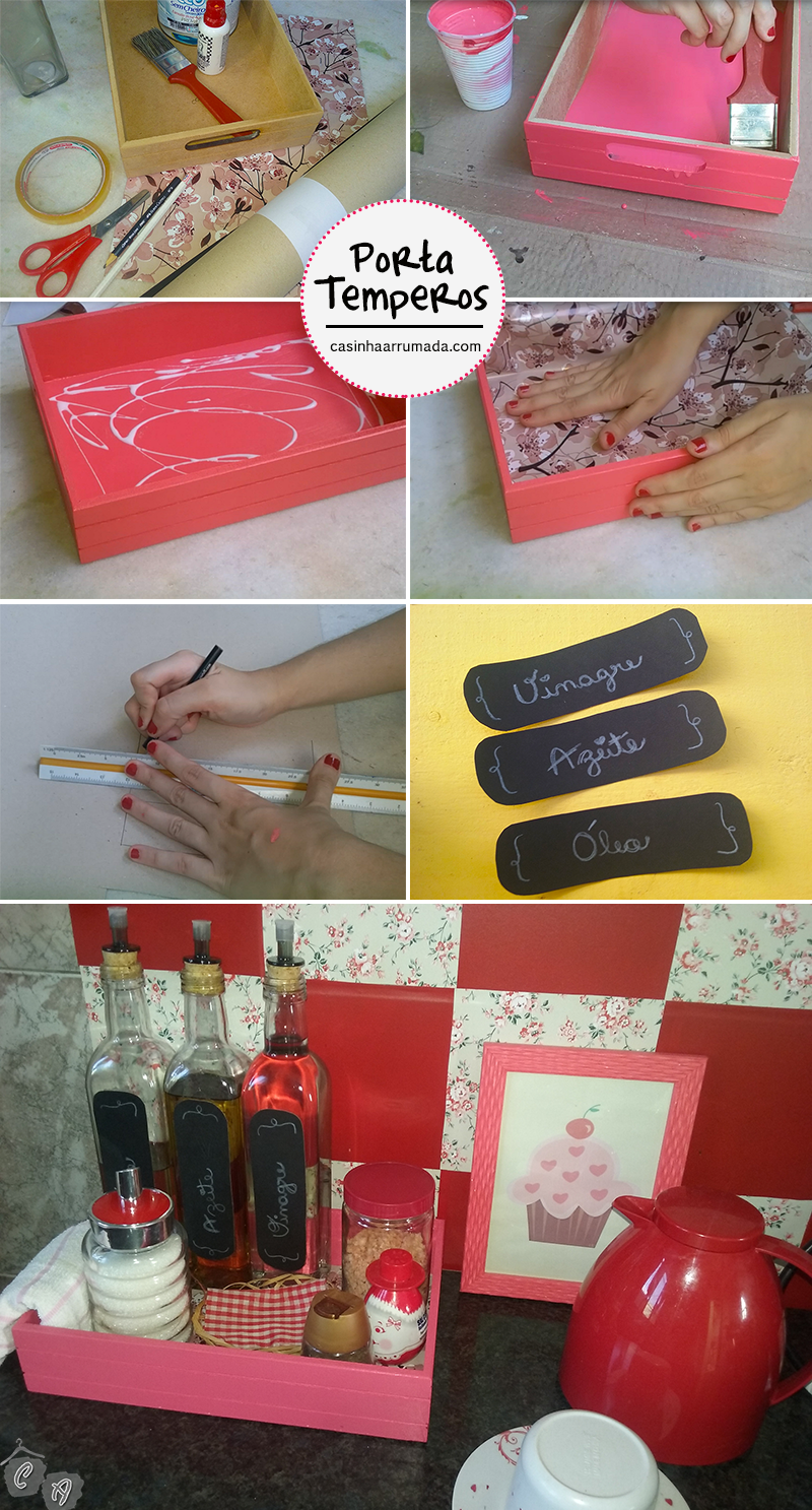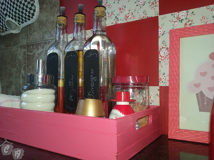 Dia desses mostrei para vocês lá no Instagram algumas garrafas para vinagre/azeite que havíamos comprado aqui para casa. A ideia era fazer um cantinho na cozinha para organizar os temperos. Procurei por inspirações na internet e acabei percebendo que uma bandeja porta temperos para decorar e organizar a cozinha seria a melhor opção! E o resultado ficou tão fofo que eu resolvi compartilhar com vocês – afinal, é uma daquelas dicas boas e baratas que todo mundo ama! 🙂