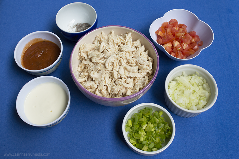 Para o recheio, em uma panela, refogue a cebola com o azeite, acrescente o tomate picado, o frango desfiado, a água, a massa de tomate, o sal e a pimenta e deixe cozinhar por alguns minutinhos até que a água seque um pouco. Acrescente a cebolinha e o requeijão, mecha bem e desligue o fogo. Reserve.