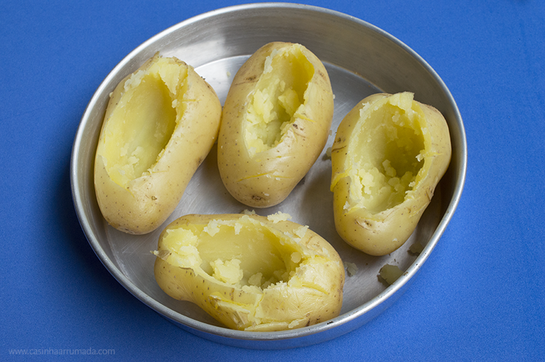 Comece lavando e cozinhando as batatas. O ponto é quando você consegue espetar a batata com um garfo e retirá-la da panela com ele. Assim que as batatas estiverem cozidas, faça um corte na batata e remova um pouco da polpa com a ajuda de uma colher.