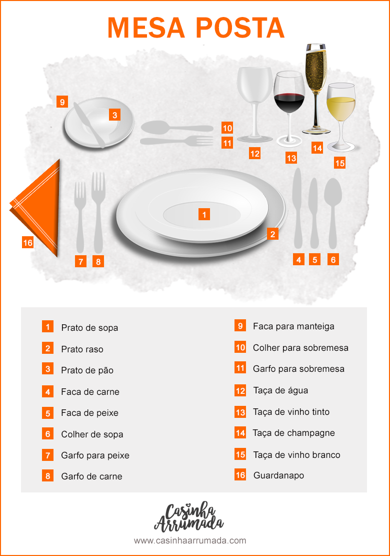 Veja abaixo uma maneira comum de disposição dos pratos, copos e talheres à mesa. Os talheres são dispostos em sequência, sendo que vamos começar a refeição usando os talheres mais afastados do prato. O guardanapo pode estar a esquerda do prato ou no centro dele. A taça de água estará a esquerda da taça de vinho tinto e a taça de vinho branco à sua direita. A taça de champagne deverá ser posicionada atrás da taça de vinho tinto.